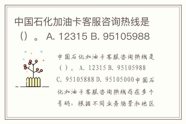 此外,全国统一客服热线95388可提供更广泛的中石化业务咨询,按“1”可转接至油品销售企业客服中心处理加油卡相关问题。但针对加油卡的专项服务,95105888/95105988仍是更直接的选择。题目选项中同时出现了B(95105988)和C(95105888),结合文档中“挂失用95105988、查询用95105888”的细分场景,若题目未限定具体业务,95105888作为通用咨询热线更符合“客服咨询”的广泛定义。
