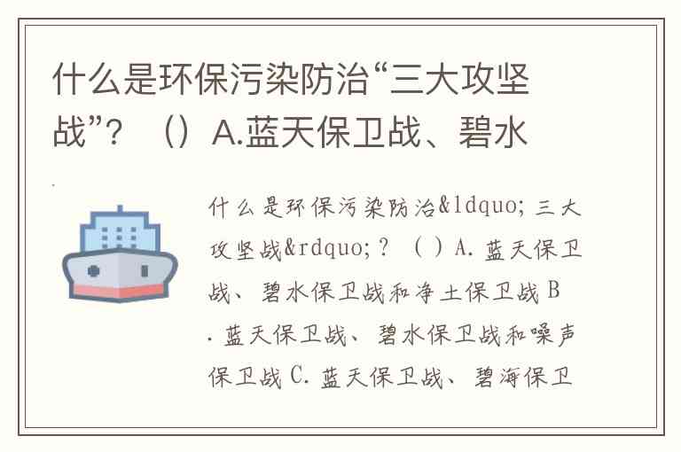 什么是环保污染防治“三大攻坚战”?()A.蓝天保卫战、碧水保卫战和净土保卫战 B.蓝天保卫战、碧水保卫战和噪声保卫战 C.蓝天保卫战、碧海保卫战和净土保卫战 D.环境保卫战、安全保卫战和消防保卫战