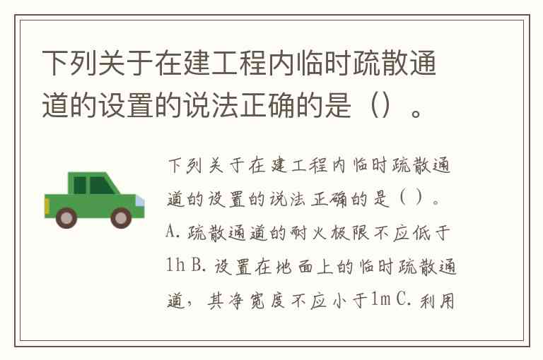 在建工程内临时疏散通道的设置需严格遵循防火规范,确保紧急情况下人员安全撤离。根据《建设工程施工现场消防安全技术规范》相关条款,正确选项为D.临时疏散通道应设置照明设施,具体分析如下: