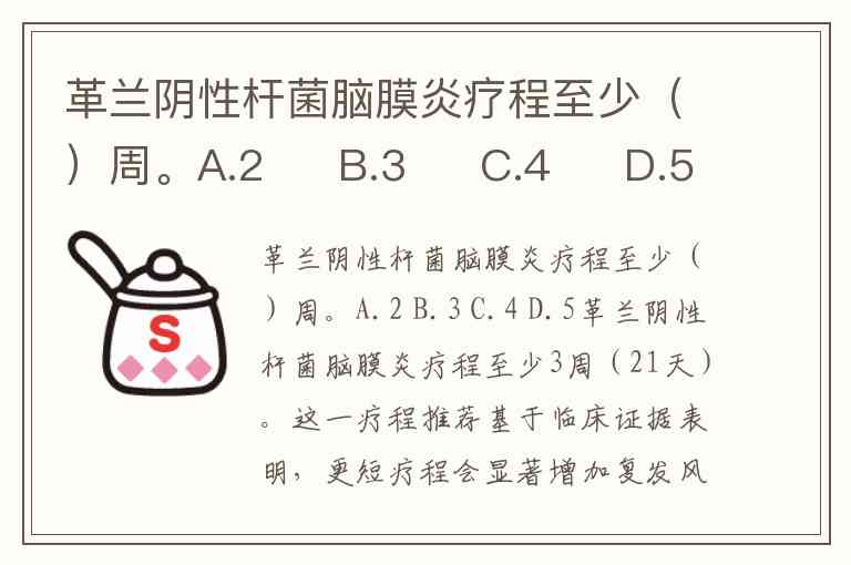 革兰阴性杆菌脑膜炎疗程至少3周(21天)。这一疗程推荐基于临床证据表明,更短疗程会显著增加复发风险。对于普通病例,规范治疗需持续21天,而特殊情况如多重耐药菌株感染或合并脑室炎时,疗程应延长至4周以上。
