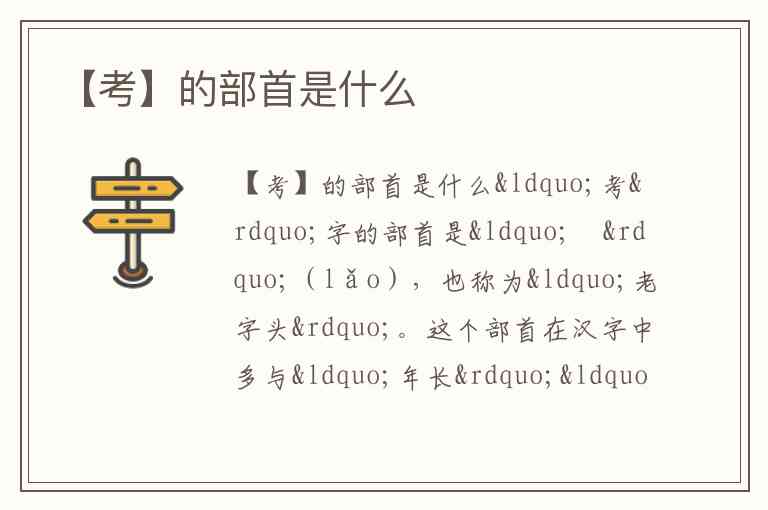 “考”字的部首是“耂”(lǎo),也称为“老字头”。这个部首在汉字中多与“年长”“长辈”相关,例如“孝”“者”“耆”等字均以“耂”为偏旁。