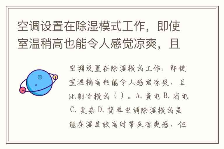 空调设置在除湿模式工作,即使室温稍高也能令人感觉凉爽,且比制冷模式()。A.费电 B.省电 C.复杂 D.简单