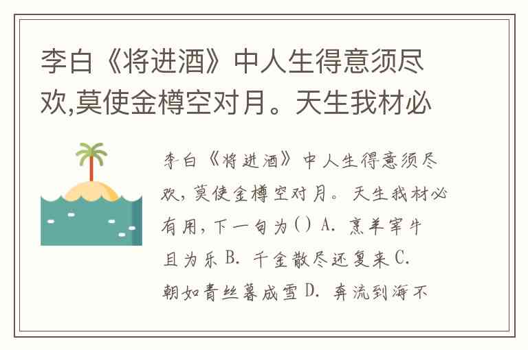 李白《将进酒》中人生得意须尽欢,莫使金樽空对月。天生我材必有用,下一句为( ) A. 烹羊宰牛且为乐 B. 千金散尽还复来 C. 朝如青丝暮成雪 D. 奔流到海不复回