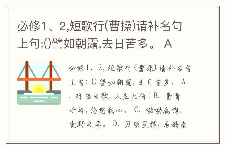 必修1、2,短歌行(曹操)请补名句上句:()譬如朝露,去日苦多。 A. 对酒当歌,人生几何! B. 青青子衿,悠悠我心。 C. 呦呦鹿鸣,食野之苹。 D. 月明星稀,乌鹊南飞。