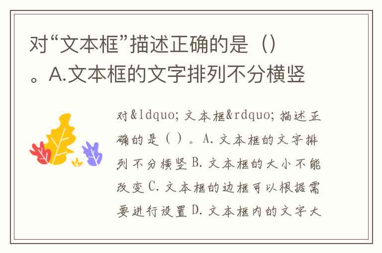 对“文本框”描述正确的是()。A.文本框的文字排列不分横竖 B.文本框的大小不能改变 C.文本框的边框可以根据需要进行设置 D.文本框内的文字大小不能改变