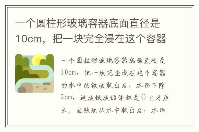 当铁块从水中取出后,水面下降部分的体积等于铁块的体积。圆柱形玻璃容器底面直径为10cm,因此半径为5cm,水面下降高度为2cm。根据圆柱体积公式 ,可计算出下降水的体积(即铁块体积):