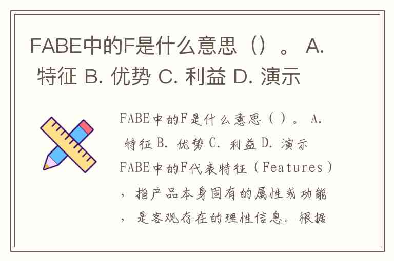 FABE中的F是什么意思()。 A. 特征 B. 优势 C. 利益 D. 演示