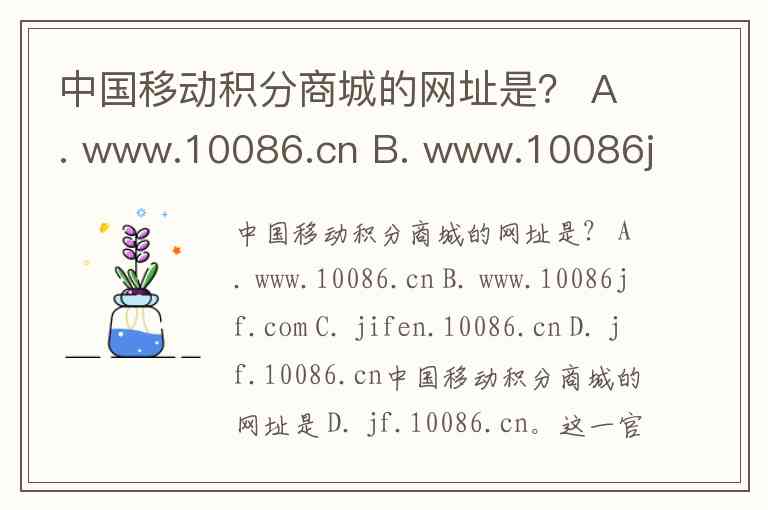 中国移动积分商城的网址是? A. www.10086.cn B. www.10086jf.com C. jifen.10086.cn D. jf.10086.cn