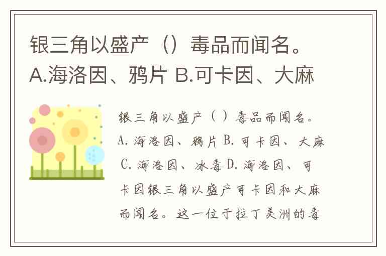 银三角以盛产()毒品而闻名。A.海洛因、鸦片 B.可卡因、大麻 C.海洛因、冰毒 D.海洛因、可卡因