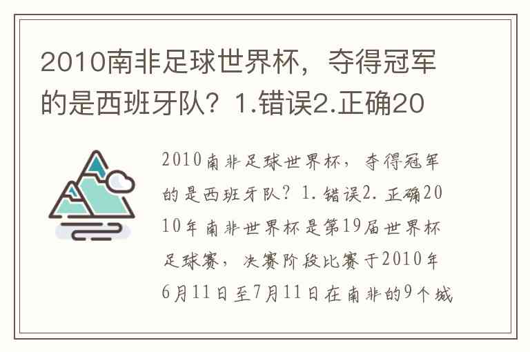 2010南非足球世界杯,夺得冠军的是西班牙队?1.错误2.正确2010年南非世界杯是第19届世界杯足球赛,决赛阶段比赛于2010年6月11日至7月11日在南非的9个城市的10座球场举行,这是世界杯足球赛首次在非洲地区举行。最终西班牙国家队获得了他们历史上的首个世界杯冠军头衔,这也是欧洲球队首次在欧洲之外的国家举办的世界杯上夺冠,西班牙、荷兰、德国三支欧洲球队包揽了这届比赛的前三名。 A. 正确 B. 错误