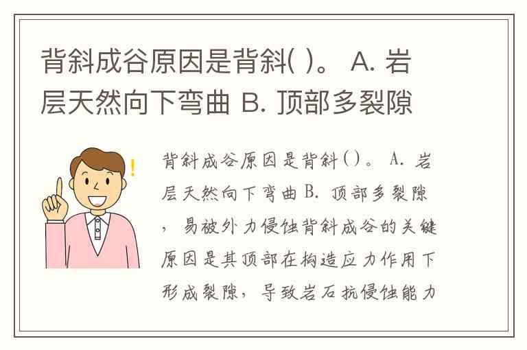 背斜成谷原因是背斜( )。 A. 岩层天然向下弯曲 B. 顶部多裂隙,易被外力侵蚀