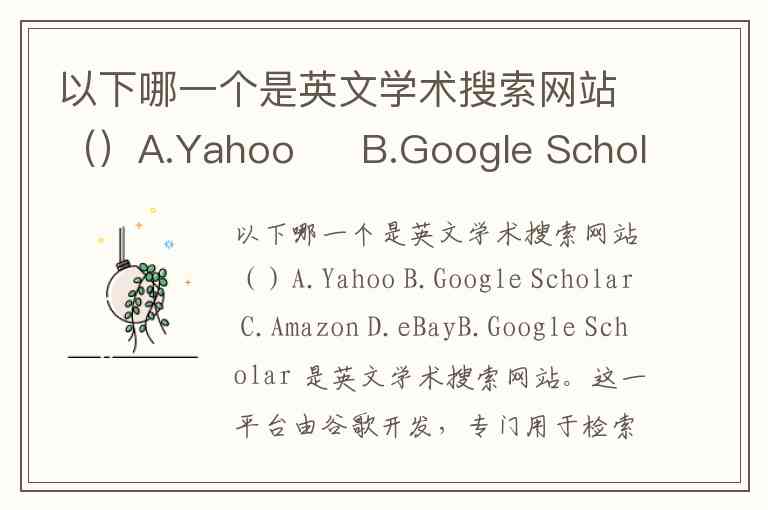 以下哪一个是英文学术搜索网站()A.Yahoo B.Google Scholar C.Amazon D.eBay