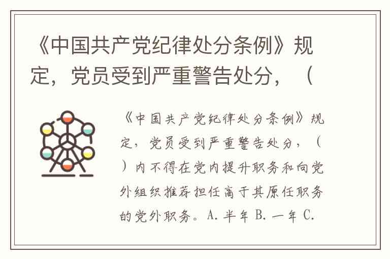 《中国共产党纪律处分条例》规定,党员受到严重警告处分,()内不得在党内提升职务和向党外组织推荐担任高于其原任职务的党外职务。A.半年 B.一年 C.一年半 D.二年