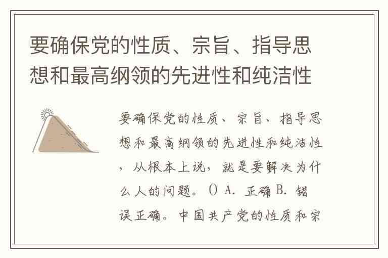 要确保党的性质、宗旨、指导思想和最高纲领的先进性和纯洁性,从根本上说,就是要解决为什么人的问题。() A. 正确 B. 错误