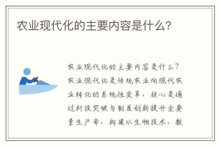 农业现代化是传统农业向现代农业转化的系统性变革,核心是通过科技突破与制度创新提升全要素生产率,构建以生物技术、数字技术和绿色技术为引擎的新型农业发展范式。这一进程不仅涉及生产工具的革新,更包含经营体系、产业形态和政策支持的全方位升级,最终实现农业强、农村美、农民富的目标。