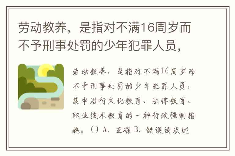 劳动教养,是指对不满16周岁而不予刑事处罚的少年犯罪人员,集中进行文化教育、法律教育、职业技术教育的一种行政强制措施。( ) A. 正确 B. 错误