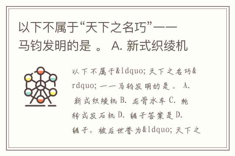 以下不属于“天下之名巧”一一马钧发明的是 。 A. 新式织绫机 B. 龙骨水车 C. 轮转式发石机 D. 锯子
