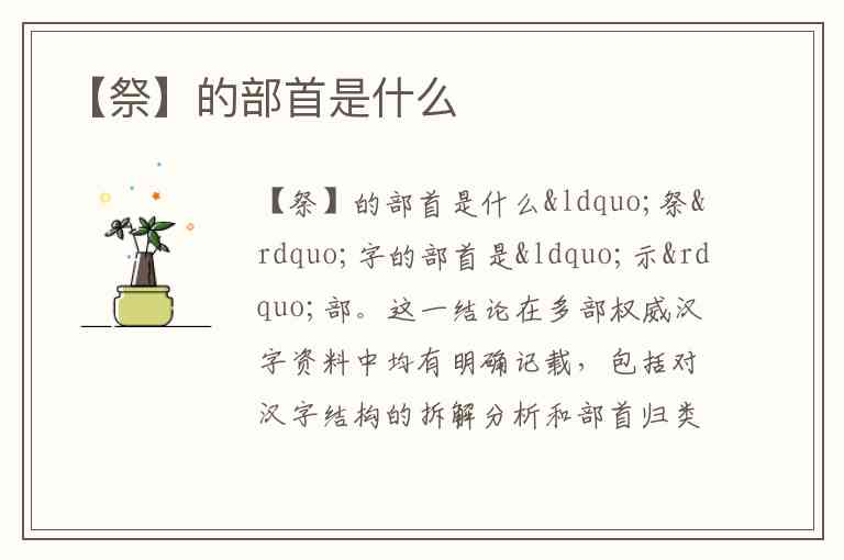 “祭”字的部首是“示”部。这一结论在多部权威汉字资料中均有明确记载,包括对汉字结构的拆解分析和部首归类标准。作为部首的“示”部通常与祭祀、礼仪相关,正契合“祭”字本义——表示对祖先或神灵的供奉,体现了汉字形义结合的特点。从字形结构看,“祭”为上下结构,上部为“月”(变形的“肉”),下部为“示”,总笔画11画,其中部首“示”占5画,部外笔画6画。了解这一构字原理,不仅能准确掌握部首,还能通过“示”部的表意功能加深对祭祀文化相关汉字的理解。你还想了解哪些与“祭”字相关的文化含义或同源汉字呢?