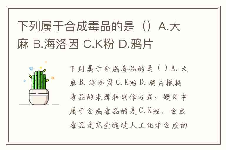 下列属于合成毒品的是()A.大麻 B.海洛因 C.K粉 D.鸦片