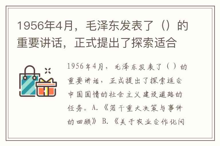 1956年4月,毛泽东发表了()的重要讲话,正式提出了探索适合中国国情的社会主义建设道路的任务。A.《若干重大决策与事件的回顾》 B.《关于农业合作化问题》 C.《关于正确处理人民内部矛盾的问题》 D.《论十大关系》