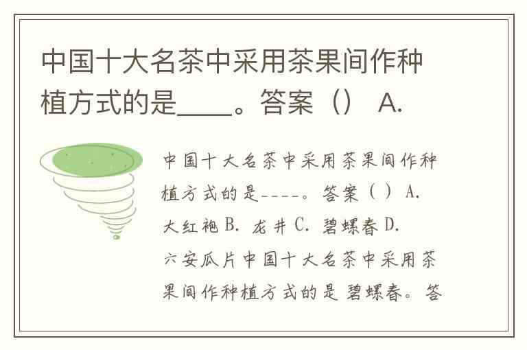 中国十大名茶中采用茶果间作种植方式的是____。答案() A. 大红袍 B. 龙井 C. 碧螺春 D. 六安瓜片