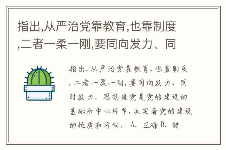 指出,从严治党靠教育,也靠制度,二者一柔一刚,要同向发力、同时发力。思想建党是党的建设的基础和中心环节,决定着党的建设的性质和方向。 A. 正确 B. 错误