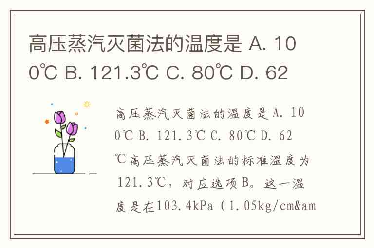 高压蒸汽灭菌法的温度是 A. 100℃ B. 121.3℃ C. 80℃ D. 62℃
