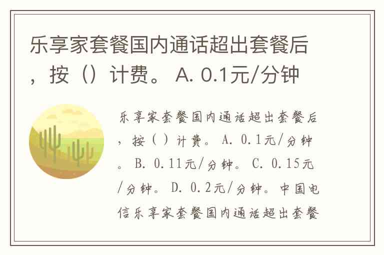 乐享家套餐国内通话超出套餐后,按()计费。 A. 0.1元/分钟。 B. 0.11元/分钟。 C. 0.15元/分钟。 D. 0.2元/分钟。