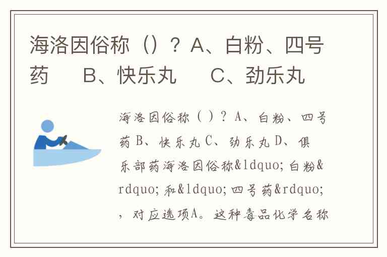 其他选项中,“快乐丸”通常指亚甲二氧基甲基苯丙胺(MDMA),属于合成毒品;“劲乐丸”并非标准毒品名称;“俱乐部药”是对一类在娱乐场所滥用药物的统称,均与海洛因无关。认清这些俗称有助于提高对毒品的辨识能力,远离“白色恶魔”的危害。