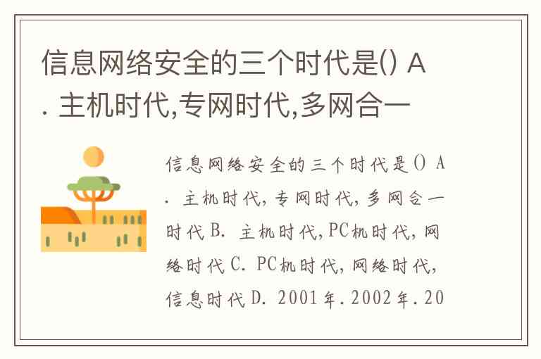 信息网络安全的三个时代是() A. 主机时代,专网时代,多网合一时代 B. 主机时代,PC机时代,网络时代 C. PC机时代,网络时代,信息时代 D. 2001年.2002年.2003年