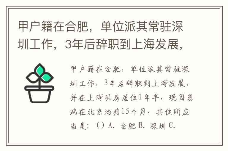 甲户籍在合肥,单位派其常驻深圳工作,3年后辞职到上海发展,并在上海买房居住1年半,现因患病在北京治疗15个月,其住所应当是:( ) A. 合肥 B. 深圳 C. 上海 D. 北京