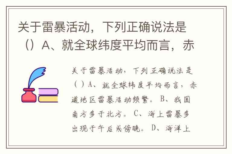 关于雷暴活动,下列正确说法是()A、就全球纬度平均而言,赤道地区雷暴活动频繁。 B、我国南方多于北方。 C、海上雷暴多出现于午后或傍晚。 D、海洋上雷暴活动明显大于同一纬度的陆地地区。