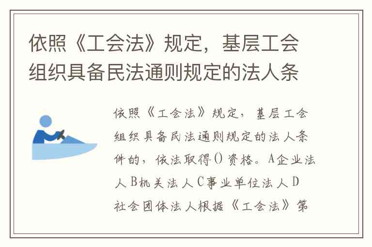 依照《工会法》规定,基层工会组织具备民法通则规定的法人条件的,依法取得()资格。A企业法人 B机关法人 C事业单位法人 D社会团体法人