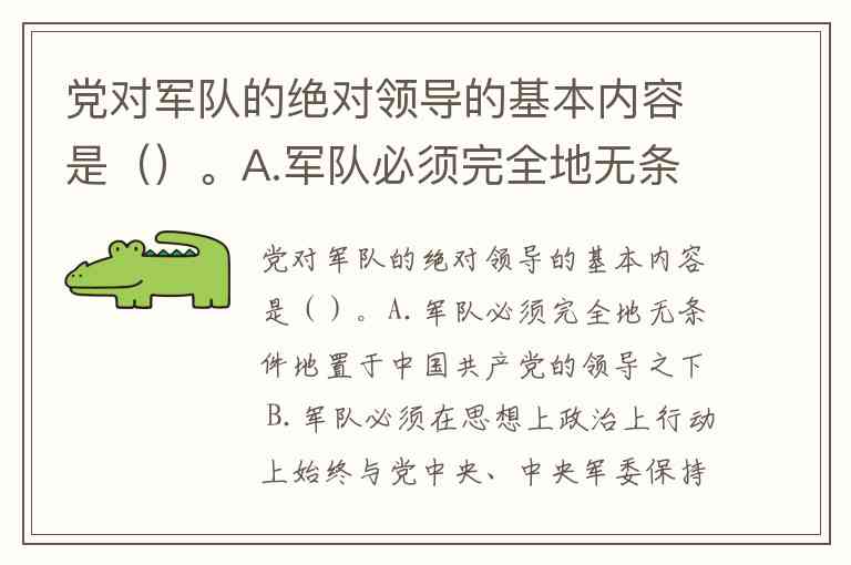 党对军队的绝对领导的基本内容是()。A.军队必须完全地无条件地置于中国共产党的领导之下 B.军队必须在思想上政治上行动上始终与党中央、中央军委保持高度一致 C.军队必须坚决维护党中央、中央军委权威 D.军队必须任何时候任何情况下都坚决听从党中央、中央军委指挥