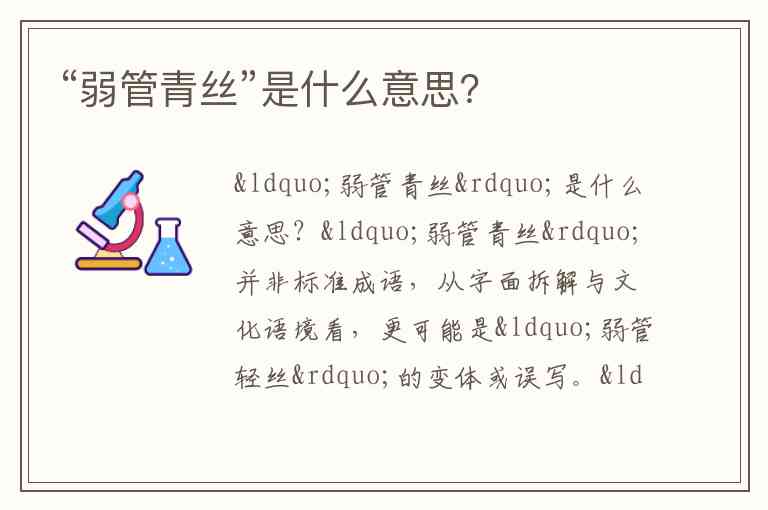 “弱管青丝”并非标准成语,从字面拆解与文化语境看,更可能是“弱管轻丝”的变体或误写。“弱管轻丝”是形容乐声轻柔细弱的成语,其中“弱管”指轻柔的管乐器(如笛子、箫),“轻丝”原指琴弦(因古代琴弦常用丝线制成),合起来描绘音乐如丝管合奏般细腻缠绵。唐代刘长卿《幽琴》诗中“飀飀青丝上,静听松风寒”,便以“青丝”代指琴弦,可见这一意象在古典文学中早有使用。