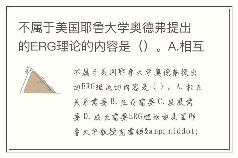 不属于美国耶鲁大学奥德弗提出的ERG理论的内容是()。A.相互关系需要 B.生存需要 C.发展需要 D.成长需要