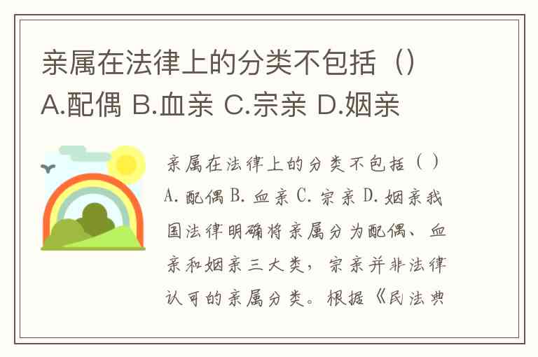 亲属在法律上的分类不包括()A.配偶 B.血亲 C.宗亲 D.姻亲