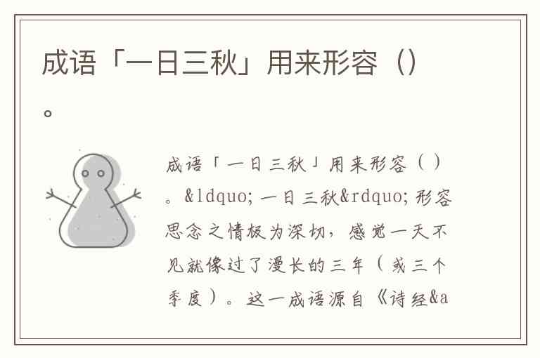 这种表达的精妙之处在于,它将抽象的情感量化为可感知的时间维度。正如《采葛》中用植物生长周期(葛需三月、萧需三秋、艾需三岁)暗喻情感浓度的递增,后世用法也始终保留着“心理时间>物理时间”的核心特质。当我们说“一日三秋”时,实际是在诉说:因为牵挂,每一秒都被思念的重量填满,短暂分离也变得漫长得令人难捱。这种将时间感知与情感强度绑定的智慧,正是汉语成语“言简意丰”的生动体现。