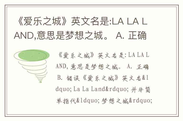 《爱乐之城》英文名是:LA LA LAND,意思是梦想之城。 A. 正确 B. 错误