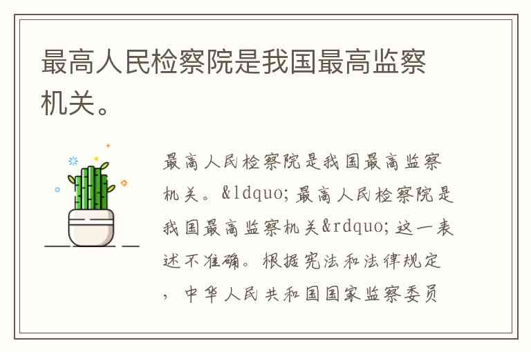 “最高人民检察院是我国最高监察机关”这一表述不准确。根据宪法和法律规定,中华人民共和国国家监察委员会才是我国最高监察机关,而最高人民检察院是国家法律监督机关,二者性质与职能存在明确区分。