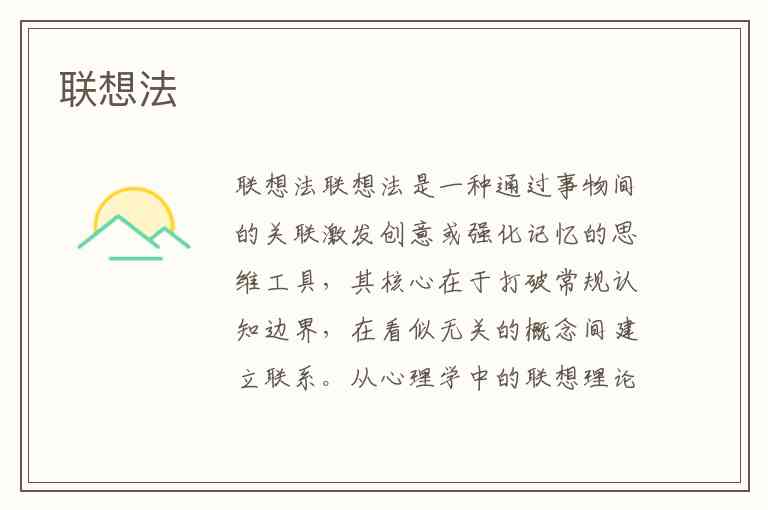 联想法是一种通过事物间的关联激发创意或强化记忆的思维工具,其核心在于打破常规认知边界,在看似无关的概念间建立联系。从心理学中的联想理论发展而来,它既可以是自由跳跃的灵感迸发,也可以是结构化的逻辑推导,广泛应用于学习、创新、治疗等多个领域。