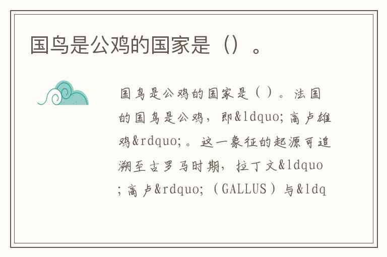 法国的国鸟是公鸡,即“高卢雄鸡”。这一象征的起源可追溯至古罗马时期,拉丁文“高卢”(GALLUS)与“雄鸡”拼写相同,罗马人的戏称意外将两者绑定,形成“高卢亦雄鸡,雄鸡亦高卢”的文化符号。作为法兰西民族最古老的图腾之一,公鸡被赋予英勇、顽强的精神特质,其形象渗透在法国文化的方方面面——从巴黎街头的雕塑、乡村教堂的风信鸡,到贵族纹章上的图案。1998年法国世界杯期间,公鸡更成为国家符号的集中展示,吉祥物、招贴画乃至民众脸上的彩绘都以其为主题,形成“满目所见,皆是雄鸡”的盛况。这种从语言巧合到文化认同的演变,让公鸡不仅是国鸟,更成为法国民族性格的生动隐喻。为何动物图腾总能超越自然属性,成为国家精神的载体?这背后或许藏着每个文明对自身特质最诗意的诠释。