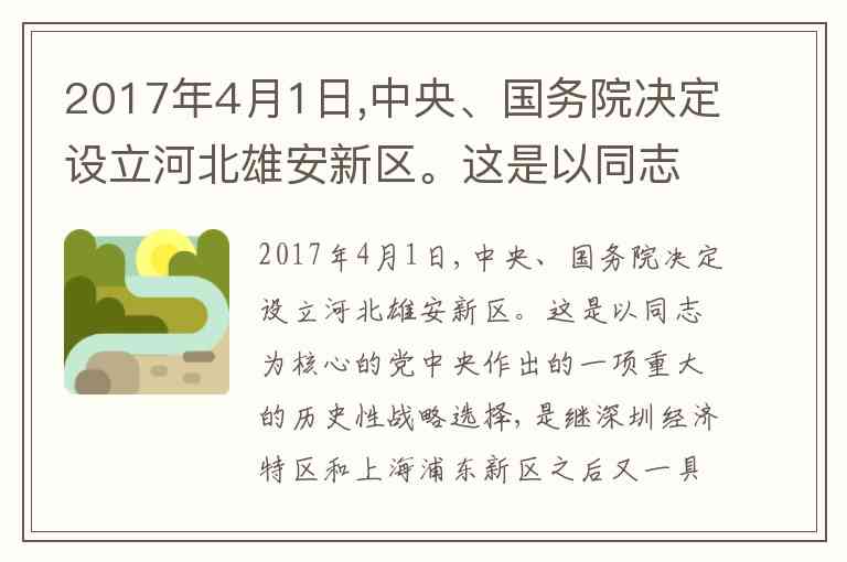 2017年4月1日,中共中央、国务院正式印发通知设立河北雄安新区,这一决策被明确表述为"以习近平同志为核心的党中央作出的一项重大的历史性战略选择",与深圳经济特区、上海浦东新区并列为"具有全国意义的新区",并定位为"千年大计、国家大事"。这一表述在新华社权威报道及后续党中央文件中被持续确认,构成理解雄安新区战略地位的核心定性。