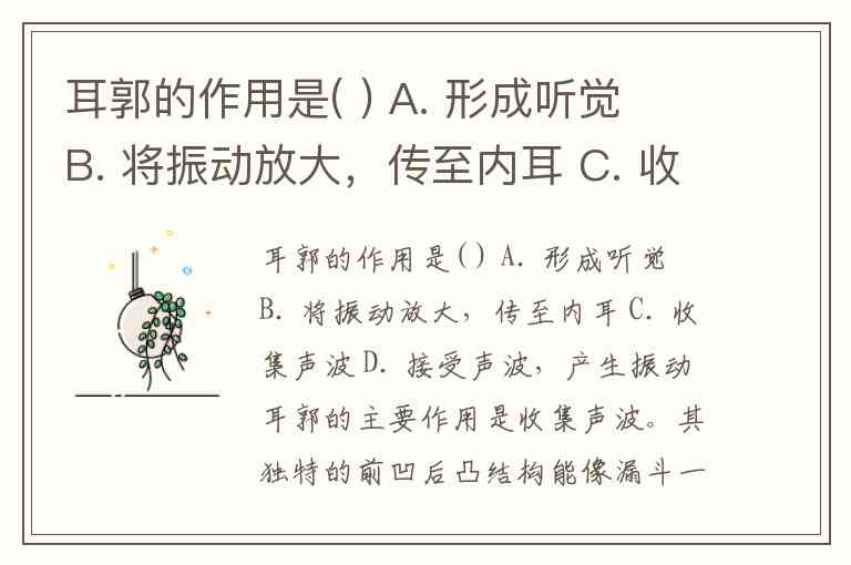 耳郭的作用是( ) A. 形成听觉 B. 将振动放大,传至内耳 C. 收集声波 D. 接受声波,产生振动