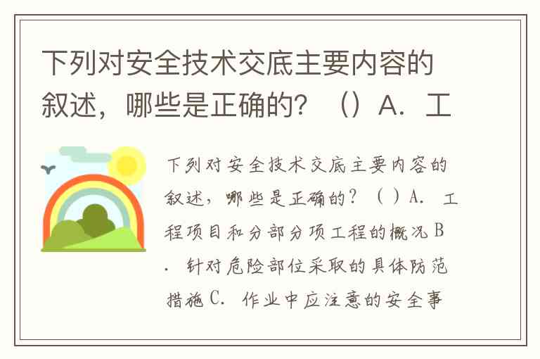 安全技术交底是施工安全管理的核心环节,其内容需覆盖工程全周期风险防控。根据《安全技术交底制度》及行业规范,题目中 A、B、C、D、E选项均为正确内容,具体依据如下: