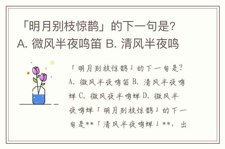 「明月别枝惊鹊」的下一句是? A. 微风半夜鸣笛 B. 清风半夜鸣蝉 C. 微风夜半鸣蝉 D. 微风半夜鸣蝉