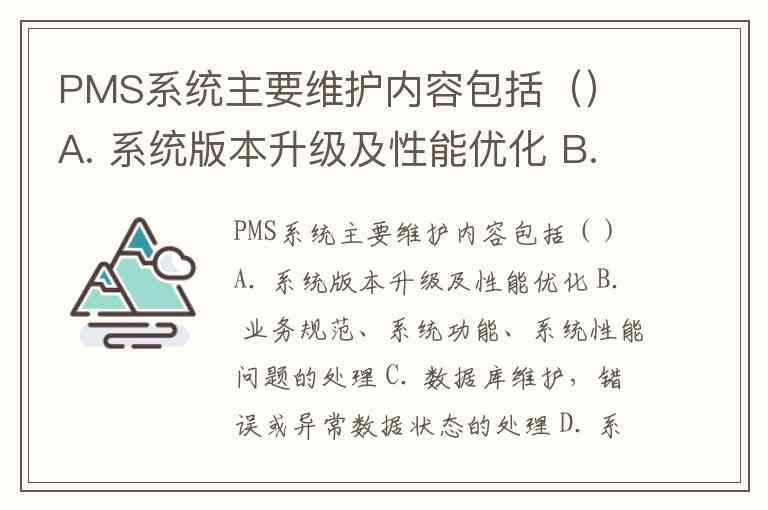 综上,A、B、C、D四项均为PMS系统的核心维护内容。不同行业的实践表明,系统性维护需技术与业务协同——既要有“数据库优化、版本升级”