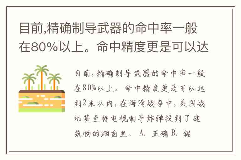 目前,精确制导武器的命中率一般在80%以上。命中精度更是可以达到2米以内,在海湾战争中,美国战机甚至将电视制导炸弹投到了建筑物的烟囱里。 A. 正确 B. 错误