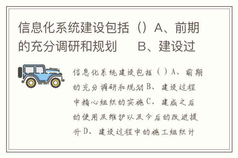 信息化系统建设包括()A、前期的充分调研和规划 B、建设过程中精心组织的实施 C、建成之后的使用及维护以及今后的改进提升 D、建设过程中的施工组织计划的制定