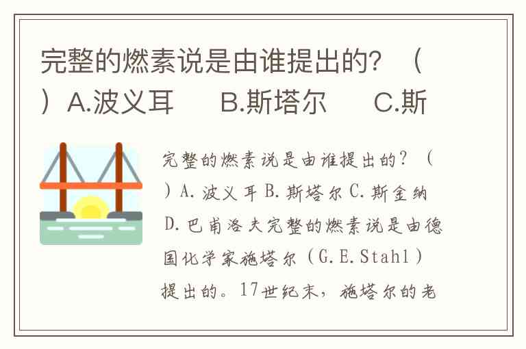 完整的燃素说是由德国化学家施塔尔(G.E.Stahl) 提出的。17世纪末,施塔尔的老师贝歇尔提出“油状土”是燃烧的关键成分,而施塔尔在1703年继承并系统发展了这一理论,将“油状土”正式命名为“燃素”,构建了首个能解释燃烧、金属煅烧等多种化学现象的完整体系。